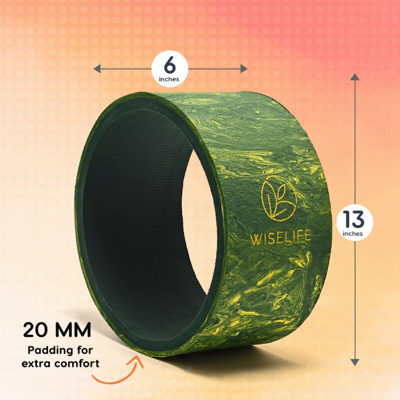 SIMPLE AND EFFECTIVE LASTING BACK PAIN RELIEF: Wiselife yoga back wheel is designed for everyday people who suffer from chronic back pain. Use it to help relieve myofascial pain and muscle tension along the spine in your upper back, lower back and neck. IMPROVE YOGA POSTURES - Wiselife offfers best back bend and stretching equipment you could have, our yoga wheel will open you for whole new range of exercises. SUPERIOR CONSTRUCTION: Yoga Wheel is made of high-quality, durable material. It's sturdy, safe and comfortable. SIZE: 13 x 6.5 inch is the perfect size for back support, stability in balance poses and easy carrying. SWEAT RESISTANT: Thanks to its superior padding, which gives moisture free accumulation, the texture makes it slip resistance and also does not retain unpleasant scents